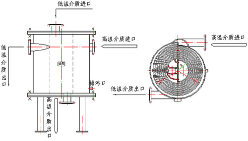 ○2可拆式Ⅱ型 可拆式Ⅱ型換熱器管內(nèi)通道為閉式,介質(zhì)螺旋狀運(yùn)行,管外通道介質(zhì)上下直通運(yùn)行,主要適用于無壓力或兩個(gè)通道壓差大的場合,管內(nèi)通道走壓力大、腐蝕嚴(yán)重者。這樣可節(jié)省材料且布局更趨合理性。